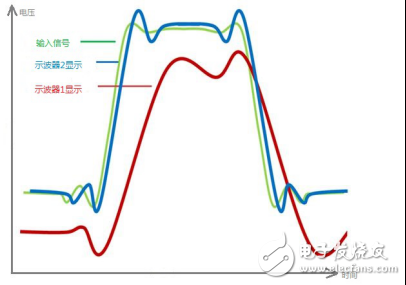 理想情况下所有示波器都具有平坦的相位和频响曲线以及相同的滚降方式。但事实上一般在示波器指标手册里都找不到相位和频响曲线,同样ENOB也没有考虑频响平坦度或相位的不一致性。图表 4显示了一个输入信号在两台不同的示波器上的测量结果。两台示波器的ENOB是相同的,但示波器1显示的波形更加接近真实的输入信号,而示波器2显示的波形就失真比较大。