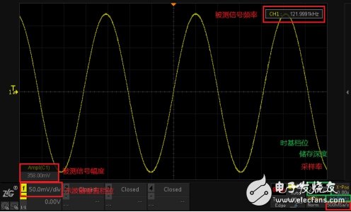 1) 示波器设置合适的垂直档位、时基档位、储存深度和采样率。采样率可通过调节时基档位和储存深度改变;