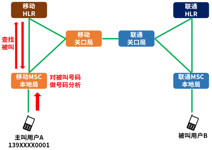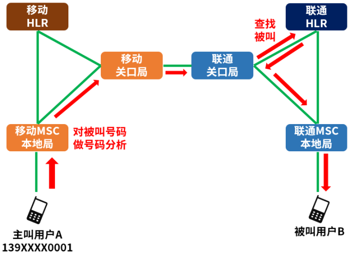 按照之前的设计,如果拨打的是138开头的号码,那MSC就会分析为中国移动的号码,按运营商内部呼叫的流程处理。(具体来说,MSC会去中国移动自己的HLR,问被叫的位置,然后一路找过去。HLR是归属位置寄存器,存储着中国移动用户的数据和信息。)
