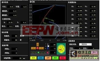 图3即赛车设计的操作界面,左边为赛车的基本参数,右边为传感器坐标设定、试验赛道生成以及传感器值的即时显示(试驾时用)。