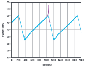 图3.电感电流的测量结果显示为蓝色,饱和电感的行为显示为附加的紫色。