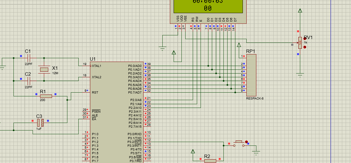#include #include unsigned code num[]={0x30,0x31,0x32,0x33,0x34,0x35,0x36,0x37,0x38,0x39}; unsigned char data x_pos, y_pos; sbit rs=P2^0; sbit rw=P2^1; sbit e=P2^2; sbit Control=P3^5; bit swit_flg=0; unsigned char time,minte,second; unsigned char result; void delay_ms(unsigned char ms) { unsigned int i,j; for(i=ms;i>0;i--) { for(j=200;j>0;j--); for(j=102;j>0;j--); } } void busy(void) { unsigned char i; P0=0xff; rs=0; rw=1; e=1; for(i=0;i<20;i++) if((P0&0x80)==0) break; e=0; } void LcdWD(unsigned char d) { busy(); rs=1; rw=0; P0=d; e=1; _nop_(); e=0; } void LcdWC(unsigned char c) { busy(); rs=0; rw=0; P0=c; e=1; _nop_(); e=0; } void LcdInit(void) { LcdWC(0x38); //显示模式设置 delay_ms(3); //延时3ms LcdWC(0x38); delay_ms(3); LcdWC(0x38); delay_ms(3); LcdWC(0x38); delay_ms(3); LcdWC(0x08); //显示关闭 LcdWC(0x01); //清屏 delay_ms(3); LcdWC(0x06); //显示光标移动设置 LcdWC(0x0c); //开显示及 光标设置 } void charlcdpos(unsigned char x,unsigned char y) { x_pos=x; y_pos=y; x_pos&=0x0f; y_pos&=0x01; if(y_pos==0) LcdWC(x_pos|0x80); // 写第一行命令 else LcdWC(x_pos|0xc0); // 写第二行命令 } void putchar(unsigned char x,unsigned char y,unsigned char c) { charlcdpos(x,y); LcdWD(c); } /* void charcursornext(void) { x_pos++; if(x_pos>15) { x_pos=0; y_pos++; y_pos&=0x1; } } */ void displayInit(void) { unsigned char tmp; tmp=time/10;putchar(4,0,num[tmp]); tmp=time%10;putchar(5,0,num[tmp]); putchar(6,0,0x3a); tmp=minte/10;putchar(7,0,num[tmp]); tmp=minte%10;putchar(8,0,num[tmp]); putchar(9,0,0x3a); tmp=second/10;putchar(10,0,num[tmp]); tmp=second%10;putchar(11,0,num[tmp]); tmp=result/10; putchar(7,1,num[tmp]); tmp=result%10;putchar(8,1,num[tmp]); } void IRS_EX0() interrupt 0 using 1 { if(swit_flg==0) { time=0; minte=0; second=0; result=0; swit_flg=1; ET0=1; ET1=1; TR0=1; TR1=1; } else if(swit_flg==1) { result=(minte*60+second)*2; swit_flg=0; ET0=0; ET1=0; } } void IRS_T0() interrupt 1 using 2 { Control=1; TH0=0XD8; TL0=0XF0; Control=0; } void ISR_T1() interrupt 3 using 2 { second++; if(second>=60) { second=0; minte++; } if(minte>=60) { minte=0; time++; } if(time>=24) time=0; } void init_TC() { TMOD=0X61; TH0=0Xd8; // TL0=0Xf0; TL1=0XbC;//TL1=0X9C; TH1=0XbC; //IE=0X8A; Control=0; // TR0=1; // TR1=1; } void init_EX0() { IT0=1; EX0=1; EA=1; } void main() { unsigned char tmp; LcdInit(); displayInit(); delay_ms(100); init_TC(); init_EX0(); while(1) { ……………………