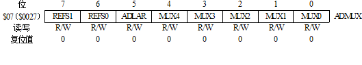 本实例中我们需要设置ADC的参考电压源为AVcc,即REFS0设置为1,ADC默认转换结果为右对齐,我们不需要改变,模拟通道选择ADC0通道单端输入,即MUX4:0。