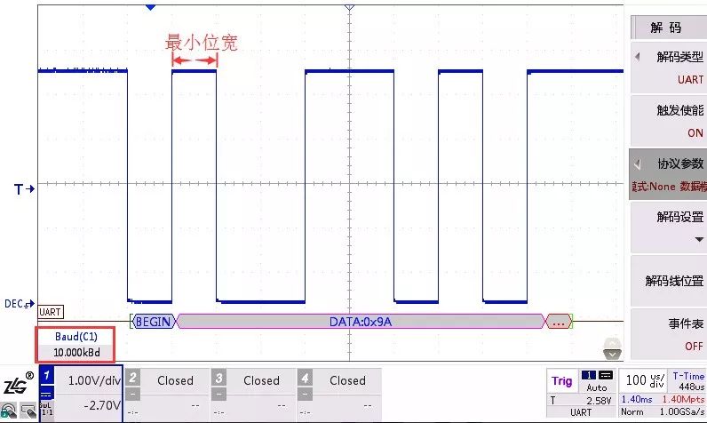 从波形出发,根据波形最小位宽估算波特率,此法适用于波特率偏差较大或不确定波特率该设置多少时。这是工程师们较习惯的自检方法。估算波特率需要看波形中的最小位宽,从来图2看,时基档位为100us,最小位宽刚好占一格,则最小位宽为100us左右,换算之后等于10000bps。
