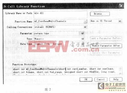 其一,直接用LabVIEW的Function模板内Advanced子模板的Port I/O图标编程,通过手动对基地址的设置,直接从特定的地址内存中读取数据。若采样速度要求不高,它是很方便直观的方法;其二,利用LabVIEW的Functions模板内Advanced子模板中CIN(Code Interface Node)图标,它适用于直接调用文字编程语言(如VC)所编写的代码。用CIN结点生成A/D驱动程序的子VI的方法可充分发挥A/D的高转换速度,获得高的采样速率。但编程较烦杂,不能由LabVIEW直接修改;其三,用LabVIEW的Functions模板内Advanced子模板中Call Library Function Node图标,动态链接数据采集卡的DLL库函数。DLL实际上是一个函数库,只在应用程序运行时DLL中的函数才被随时调用和连接。和静态连接库相比,DLL可以和其他应用程序共享库中的函数和资源。许多数据采集插卡生产商提供DLL库函数形式的驱动程序,用户可使用某种DLL链接库的编程工具,如VC、VB编写应用程序来调用它。同样,LabVIEW也提供了该功能,就是图标Call Library Function Node,放在Function模板内的Advanced子模板中,通过设置该节点来直接调用DLL。