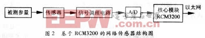 网络传感器的关键部分采用美国Z?World公司的核心模块RCM3200,该模块使用新一代嵌