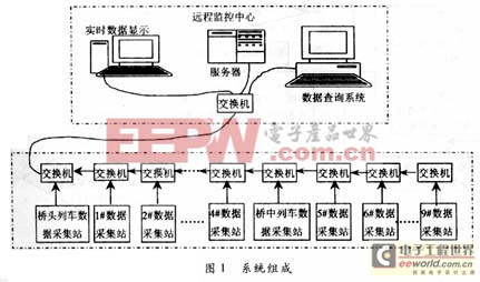 在远程监控中心,有一个服务器,两台微机,其中一台用于远程现场数据的实时显示,另一台用于数据查询。在这里可以实时显示列车通过桥头和桥中时的时间、车速、轴数、轴距(根据这些参数再结合桥梁跨中挠度及轴重监测的结果,可大致推断出列车的编组情况、
