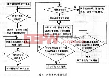 由于本远程监测系统分布范围较大,监测点多,所用网络组件较多,任何部分出现故障都可能造成数采流程的不能正常结束,为此,在系统中增加了系统总清控制,即在桥头测速站测到列车到达后,启动系统总定时,当定时时间到达10分钟后,监控程序发出总清命令,结束各测站的数据采集,断开所有测站的TCP连接,系统重新进入初始监测状态(一般来讲,列车过桥时间不会超过10分钟)。系统基本工作流程图见图3。