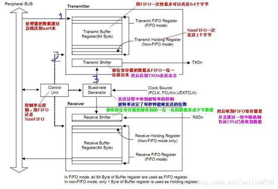 1、将外设总线的数据写入到发送缓冲区(缓冲区由控制单元中UFCONn控制寄存器设置:FIFO模式或非FIFO模式)