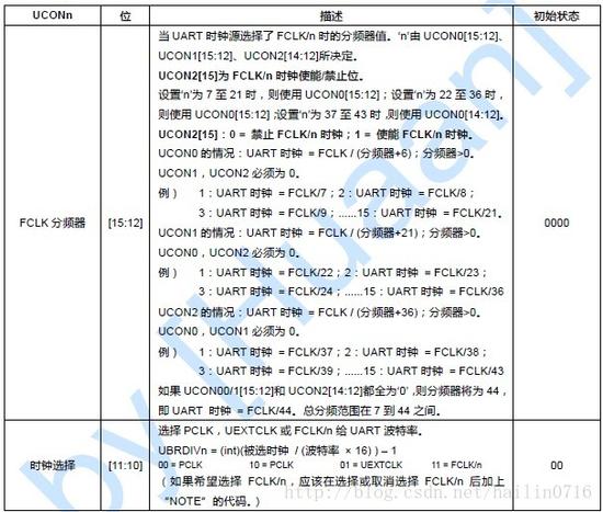 UBRDIVn寄存器:设置波特率,UART的时钟源有两种选择:PCLK、UEXTCLK、FCLK/n,其中n的值通过UCON0-UCON2联合设置