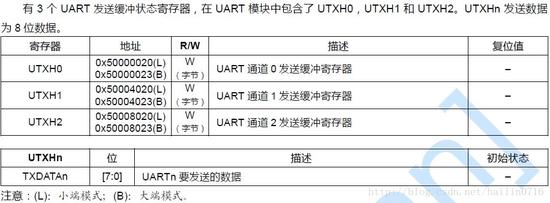 UTXHn寄存器,CPU将数据写入这个寄存器,UART即会将它保存到缓冲区中,并自动发送出去