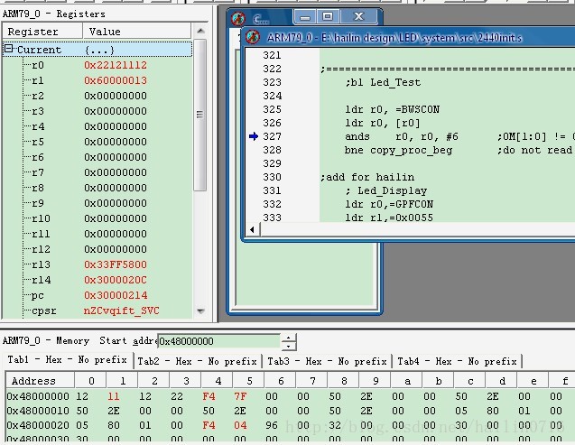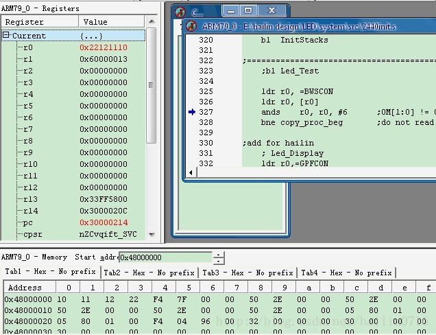 使用2440init.s文件中启动方式源码,验证启动方式。