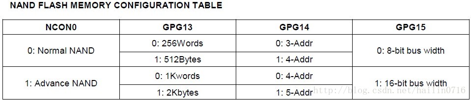 根据GPG13-15、NCON引脚配置,配置nand flash存储器(配置表详见下面)