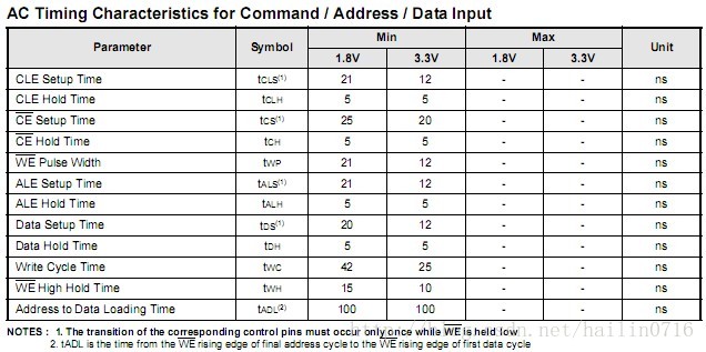 1、TACLS=NFCONF[13:12]=3,即HCLK*TACLS=30ns >12ns(表中tCLSmin)