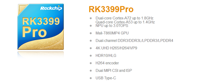 官方资料显示,RK3399Pro这颗AI芯片采用双核Cortex-A72+四核Cortex-A53的big.LITTLE大小核CPU架构,芯片在整体性能、功耗方面具技术领先性。同时,芯片还集成了四核的ARM高端GPU Mali-T860,进一步提升了芯片在图形处理方面的能力。