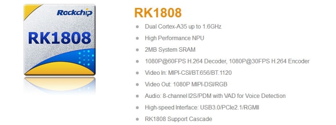 RK1808则是瑞芯微采用22nm FD-SOI工艺打造的AIoT芯片。这个芯片最为突出的特点在于能提供高达3.0TOP的NPU峰值算力的同时,还拥有了比其他对手更低的功耗。据介绍,相同性能下,RK1808的功耗相比主流28nm工艺产品可降低30%左右;内置2MB系统级SRAM,可实现always-on设备无DDR运行;具有硬件VAD功能,支持低功耗侦听远场唤醒。