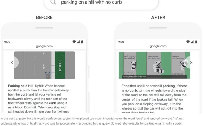 图 | BERT 能更好识别“在没有路缘的山坡停车”句子里的“没有”一词,从而理解人类意图(来源:https://blog.google)