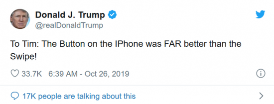 上个月,美国总统特朗普向苹果公司CEO库克发送了一条推文,哀叹没有Home键的iPhone用起来好难受,称旧的Touch ID比新的Face ID“好得多”。11月20日,库克在接受采访时回应了特朗普要求在iPhone上加回Home键的要求。
