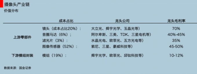 2. 中游的镜头市场有一定的技术壁垒,毛利最高可达70%,有时比做传感器还赚钱。市场规模差不多是40-50亿美金,比图像传感器小了许多。
