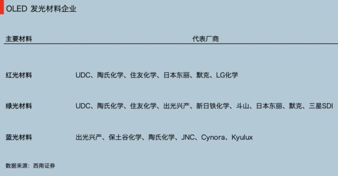 蒸镀作为面板的最重要加工环节,另一件核心装是金属掩膜板。高等级的掩膜板只有大日本印刷一家生产,三星早早的跟它签了买断协议,京东方一直苦等到2017年协议到期才顺利抢购。OLED 面板非常依赖发光材料,其中毛利率最高(70%)的蓝光材料,七成供给来自于日本的石油企业出光新产。