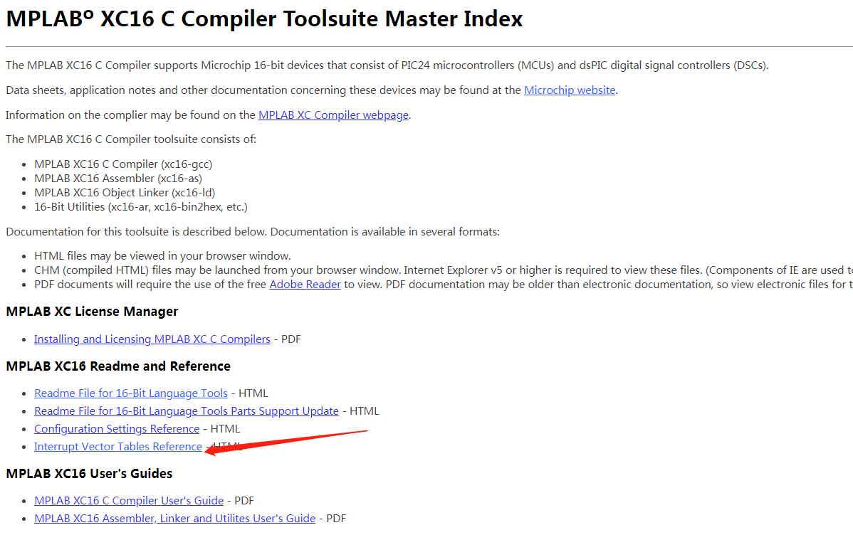 就是这个Interrupt vector tables 这里有描述,他告诉我们这个表在XC16安装目录的docs的XC16MASTERINDEX文件中。然后找到他。我的目录是 C:Program Files (x86)Microchipxc16v1.41docs,打开XC16MasterIndex