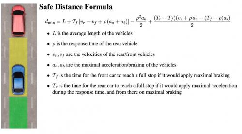 对人来说,哪怕是刚学会开车的新手,做到安全的跟车也不是件多难的事情。但如果把这个问题丢给计算机,可能就会因为要平衡各项因素而变得异常复杂。一套自动驾驶系统要做到安全跟车,既要考虑车速,不同道路的摩擦系数,还要考虑反应时间等等。所以工程师进行开发时,首要考虑的变量是:假设最坏的情况发生,自动驾驶汽车要保持怎样的距离才能最快刹停?
