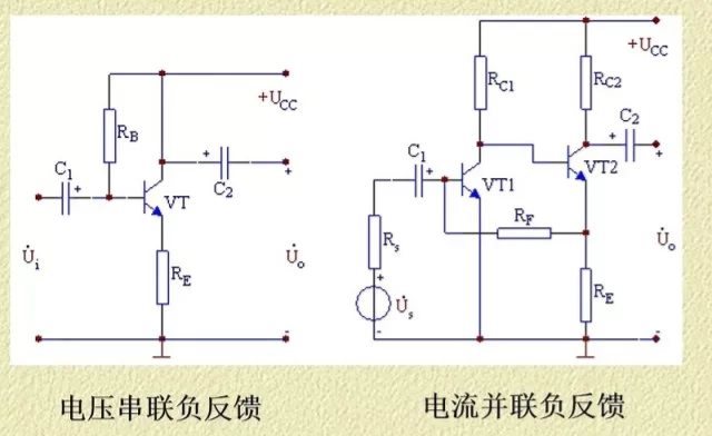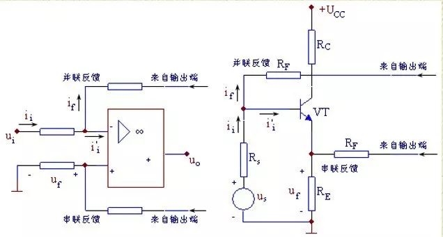 根据反馈信号与输入信号的关系,可分为串联反馈和并联反馈。反馈信号与输入信号在放大电路的输入回路中以电压的形式求和,即反馈信号与输入信号串联,称为串联反馈。反馈信号与输入信号在放大电路的输入回路中以电流的形式求和,即反馈信号与输入信号并联,称为并联反馈。