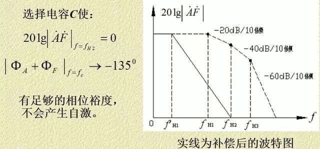 如图所示为阻容耦合单级共射放大器的频率特性,中频相移180度,在低频段和高频段,还将分别产生附加相移90度,三级负反馈放大电路则只要达到一定的反馈深度即可能产生自激振荡。