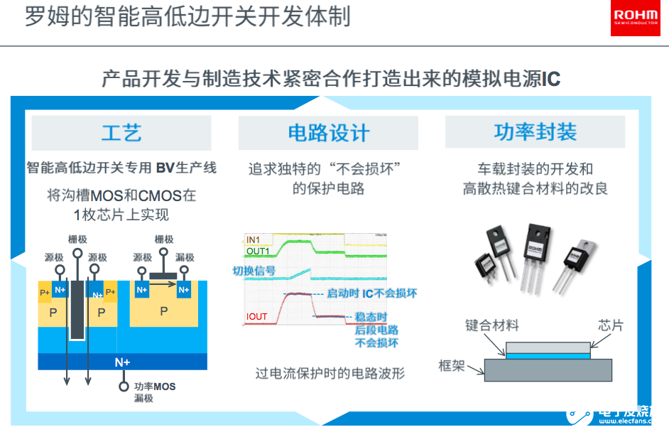罗姆半导体(深圳)有限公司技术中心经理苏勇锦在媒体见面会上介绍说,罗姆利用独特的工艺嵌入芯片,例如把功率开关的沟槽型mos与cmos做在一个器件里。电路设计当中在需要保护的状态时进行灵活的调整,另外选择优良的封装工艺,以及进行高键合材料的改良,总之通过罗姆的垂直整合,开发可靠性更高的产品。