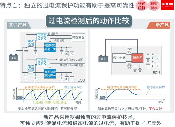 上图可以看出,普通智能高边开关其外围器件较多,而罗姆的新产品方案外围器件少,安装面积可缩减70%。苏勇锦介绍,左边普通智能高边开关启动后稳态电池使用微控制器和过电流检测IC等进行电流保护,受与智能高边开关输出端的后段电路之间的相性影响,有失控的可能性。与普通产品的解决方案相比,新产品可提供可靠性高、部件数量少的解决方案,有助于打造更安全的系统。