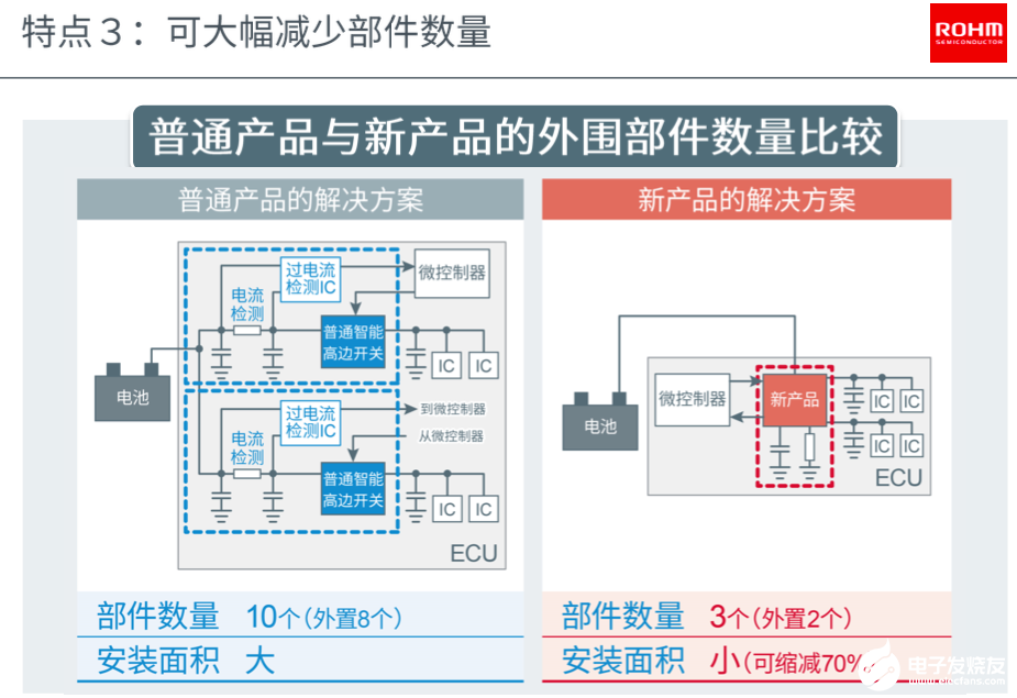针对汽车电子的应用,此次罗姆带来了最新的智能高低边开关等产品,对汽车ECU系统起到更可靠的保护。