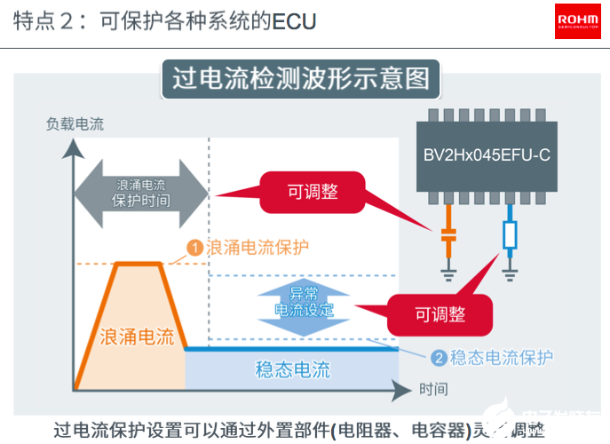 它具有独立的过电流保护功能,可独立应对浪涌电流和稳态电流的过电流,有助于提高可靠性;可保护各种系统的ECU,通过外置电容和电阻灵活调整。