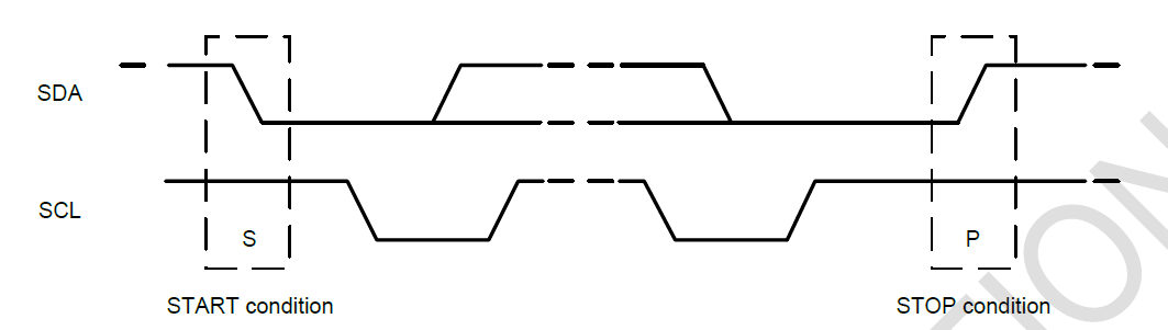 当SCL为高电平期间,SDA由高电平到低电平的跳变过程;起始信号是一种电平跳变时序信号,而不是一个电平信号,如图虚线框所示。