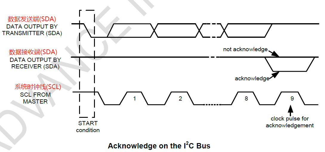 对于反馈有效应答位ACK的要求是,接收端在第9个时钟脉冲之前的低电平期间将SDA线拉低,并且确保在该时钟的高电平期间为稳定的低电平。如果接收端是主机,则在它接收到最后一个字节后,发送一个NACK信号,以通知发送端结束数据发送,并释放SDA线,以便主机接收端发送一个停止信号。