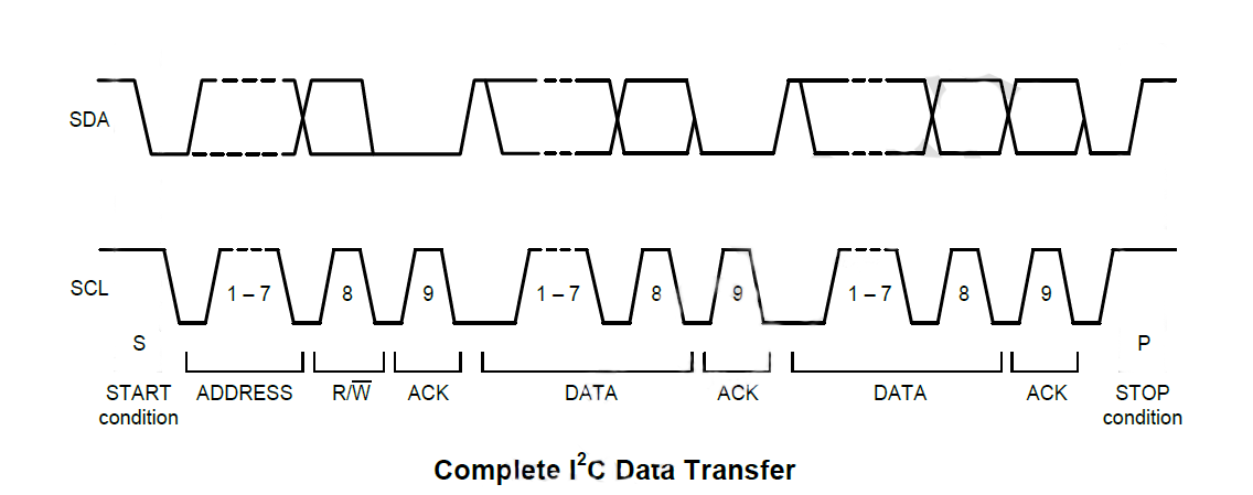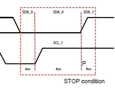 当SCL为高电平期间,SDA由低电平到高电平的跳变过程;停止信号也是一种电平跳变时序信号,而不是一个电平信号,如图虚线框所示。