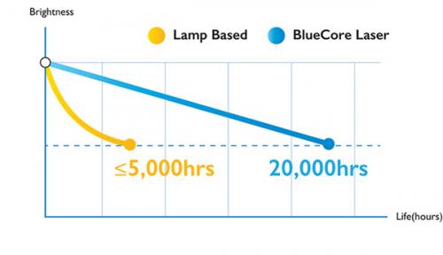 传统汞灯光源平均寿命约 5000 小时,消费者使用约 3 年就需更换灯泡,不仅麻烦,更多花一笔更换成本;而新光源在使用寿命上平均可达两万小时,相比传统投影机多了约 3 倍的使用寿命。使用更为环保节能的新光源投影,每日平均使用 6 小时,可使用长达 10 年,大幅降低了后期更换光源的成本与心力。