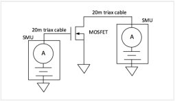可以使用两个SMU生成n型MOSFET的Id-Vg曲线。一个SMU扫描栅极电压,另一个SMU测量漏极电流。图4是典型测试电路的电路示意图,其中使用20m三芯同轴电缆把SMU连接到器件端子上。
