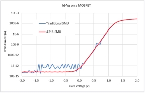图5显示了使用两个传统SMU及使用两个4211-SMU测量的传递特点。蓝色曲线(使用两个传统SMU获得)在曲线中显示了振荡,特别是在弱电流及改变电流范围时。红色曲线是使用两个4211-SMU得到的电流测量,非常稳定。