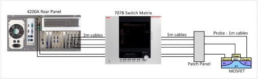 在这种情况下,SMU使用2m电缆连接到开关矩阵的行(输入)上;开关矩阵的列(输出)使用5m电缆连接到配线架上。然后再使用另一条1m电缆从配线架连接到探头,所以从一个SMU到DUT的三芯同轴电缆的总长度是: (2 x 2 m) + (2 x 5 m) + (1 m) = 15 m。除了三芯同轴电缆外,开关矩阵本身也增加了电容,在计算测试系统总电容时可能需要包括进去。