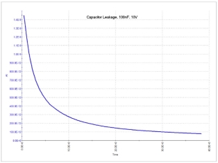 图12. 使用4201-SMU测得的100nF电容器的泄漏电流相对于时间关系图。