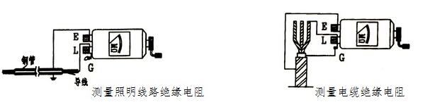 兆欧表有三个测量端钮,一个线路端钮(L),另一个是接地端钮(E),还有一个为屏蔽端钮(G)。一般测量照片或电力线路对地的绝缘电阻时,只用L和E端,接线如下左图所示。“L”端接到被测设备的“火”或“相端”,“E”端接到被测设备的“地”端。在测量电缆对地绝缘电阻时或被测设备的漏电流严重时,使用“G”端钮。如下右图所示为测量电缆绝缘电阻接线图。
