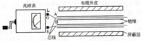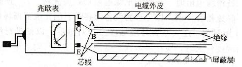 2、正确接线:兆欧表有三个接线柱:线路(L)、接地(E)、屏蔽(G)。根据不同测量对象,进行相应接线,如图1、图2所示。测量线路对地绝缘电阻时,E端接地,L端接于被测线路上;测量电机或设备绝缘电阻时,E端接电机或设备外壳,L端接被测绕组的一端;测量电机或变压器绕组间绝缘电阻时先拆除绕组间的连接线,将E、L端分别接于被测的两相绕组上;测量电缆绝缘电阻时E端接电缆外表皮(铅套)上,L端接线芯,G端接芯线最外层绝缘层上。