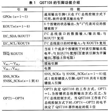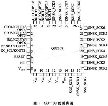 其工作原理采用了美国昆腾公司的电荷转移电容专利技术(QProx),支持8个独立按键,且可选择按键状态检测输出或I2C总线控制2种正常工作方式;同时,通过软件命令可使其进入低功耗模式,当有按键按下时可被唤醒。QST108特有的相邻按键抑制算法使得一个按键在按下未松开时,其他按键处于无效状态;自校准和自动漂移补偿功能使其无须人工校准,从而进一步降低了QST108的应用难度。引脚配置如图1所示,各引脚功能如表1所列。