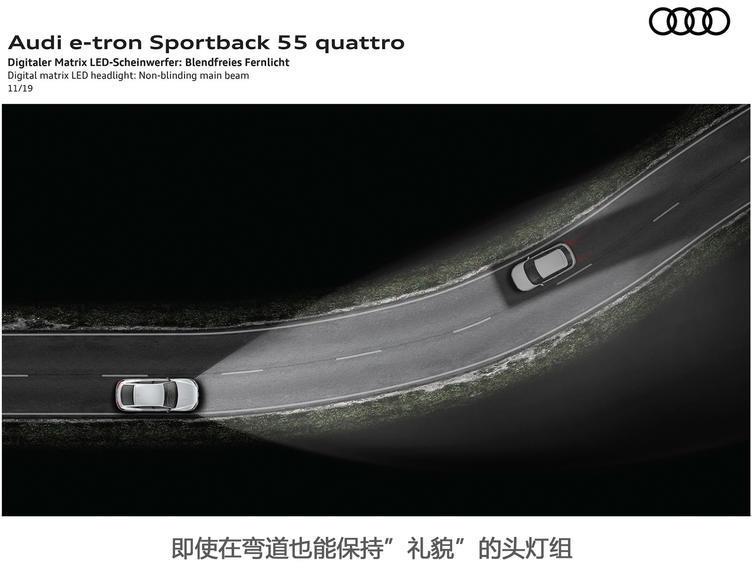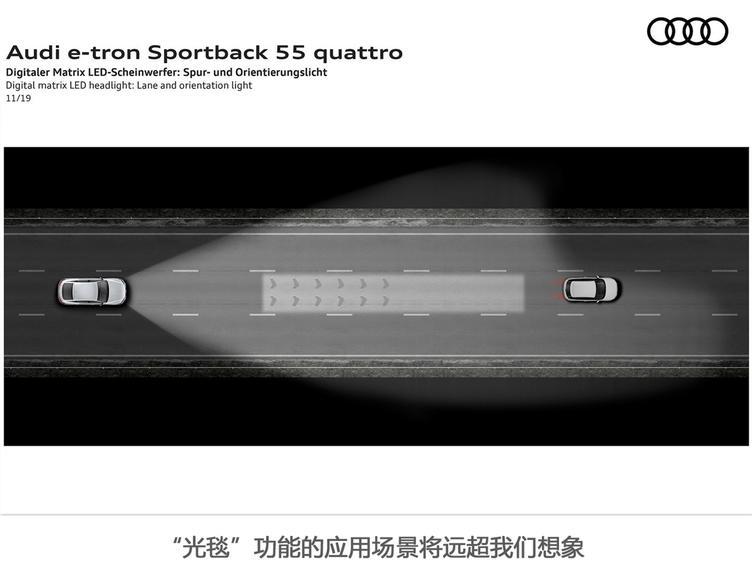 更厉害的是,e-tron Sportback的头灯组还能根据车道线角度,在地面投射出一条与车身同宽的“光毯”,不仅起到指明前路的作用,还能在狭窄路段帮助驾驶者确认路够不够宽。