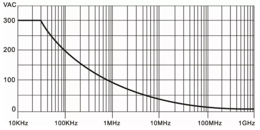 最大输入电压是指探头可以输入的最大额定值的电压。最大输入电压取决于探头机身和探头内部器件的额定击穿电压。一般该项会通过一些安规规范来给出,而不是给出单一的电压,比如一般10×的无源探头的最大输入电压为300VRMS CAT Ⅱ。其中CAT Ⅱ 指的是一类测试场景,300VRMS CAT Ⅱ指的是在这类测试场景下可以测量的最大电压。而且这个电压并不是一个恒定值。而是会随着频率的变化而变化。一般探头会给出自己的电压额定曲线,如下图所示: