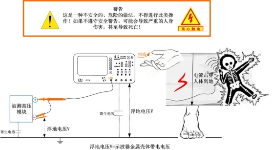 使用探头进行测量时,最重要的就是安全问题。比如使用无源探头时,探头的地线与示波器的地是连接在一起的,当示波器安全接地的时候,探头是安全的。但是当示波器没有安全接地时,探头的地线就会存在一定的电压从而给使用者带来危险。具体情况如图5所示: