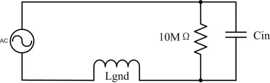 由于地夹线比较长,其会形成一个寄生电感Lgnd,随着夹线的增长,这个电感也会增大,而这个回路电感会和示波器探头的输入电容Cin产生谐振。这就导致示波器的幅频特性变得不平坦,导致测量不准确。下图为使用接地夹时的等效电路。