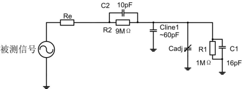 前文提到过,探头都是具有输入电容和输入电阻的,这就导致其并不能当成一个阻抗无穷大的设备,其测量时的等效模型如下图所示。