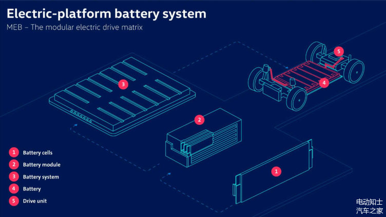 电池组成模块,模块构成系统,电池系统的电池包数量是可变的,所以这种MEB平台灵活性很强,如果需要更大的电池容量,就在电池系统中安装更多的电池组,基本结构保持不变。