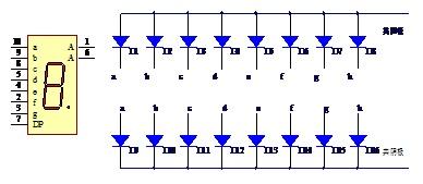 LED数码管是由a、b、c、d、e、f、g、h这8段发光二极管组成的“8”字形显示器件。LED数码管分为共阳极和共阴极两种,如图7所示,如果每段的阳极接在一起则为共阳极LED,如果每段的阴极接在一起则为共阴极LED。此次课设中,我所用的数码管为共阴极的。